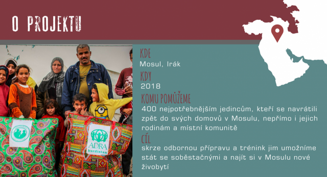 Podle místní samosprávy potřebují lidé jako Mohammed komplexní podporu vedoucí k zajištění základních životních podmínek. ADRA na dané potřeby reaguje prostřednictvím projektu, který skrze odbornou přípravu a trénink umožní 400 nejpotřebnějším jedincům stát se soběstačnými a najít si v Mosulu nové živobytí. V průběhu několikaměsíčního školení jim navíc bude poskytována výživná strava, která by měla přispět ke zlepšení jejich zdravotního stavu.