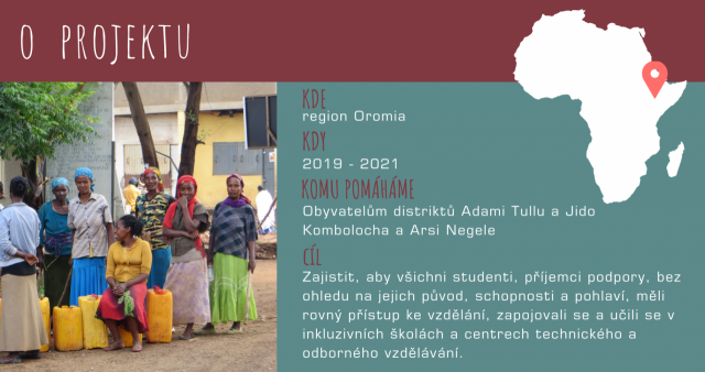 Za finanční podpory České rozvojové agentury ADRA společně s partnery z Norska a Etiopie podporuje v Etiopii inkluzivní vzdělávání v regionu Oromiya, oblasti Arsi Negele. Komplexní pojetí projektu zahrnuje podporu dětí a jejich rodičů, učitelů a zástupců škol, školských úřadů i technických kapacit samotných škol.